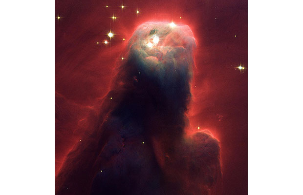 Sebuah gas raksasa dan pilar debu di Nebula Trifid, dijelaskan dengan sebuah pilar kecil menunjuk ke atas dan sebuah jet aneh mengarah ke kiri.
